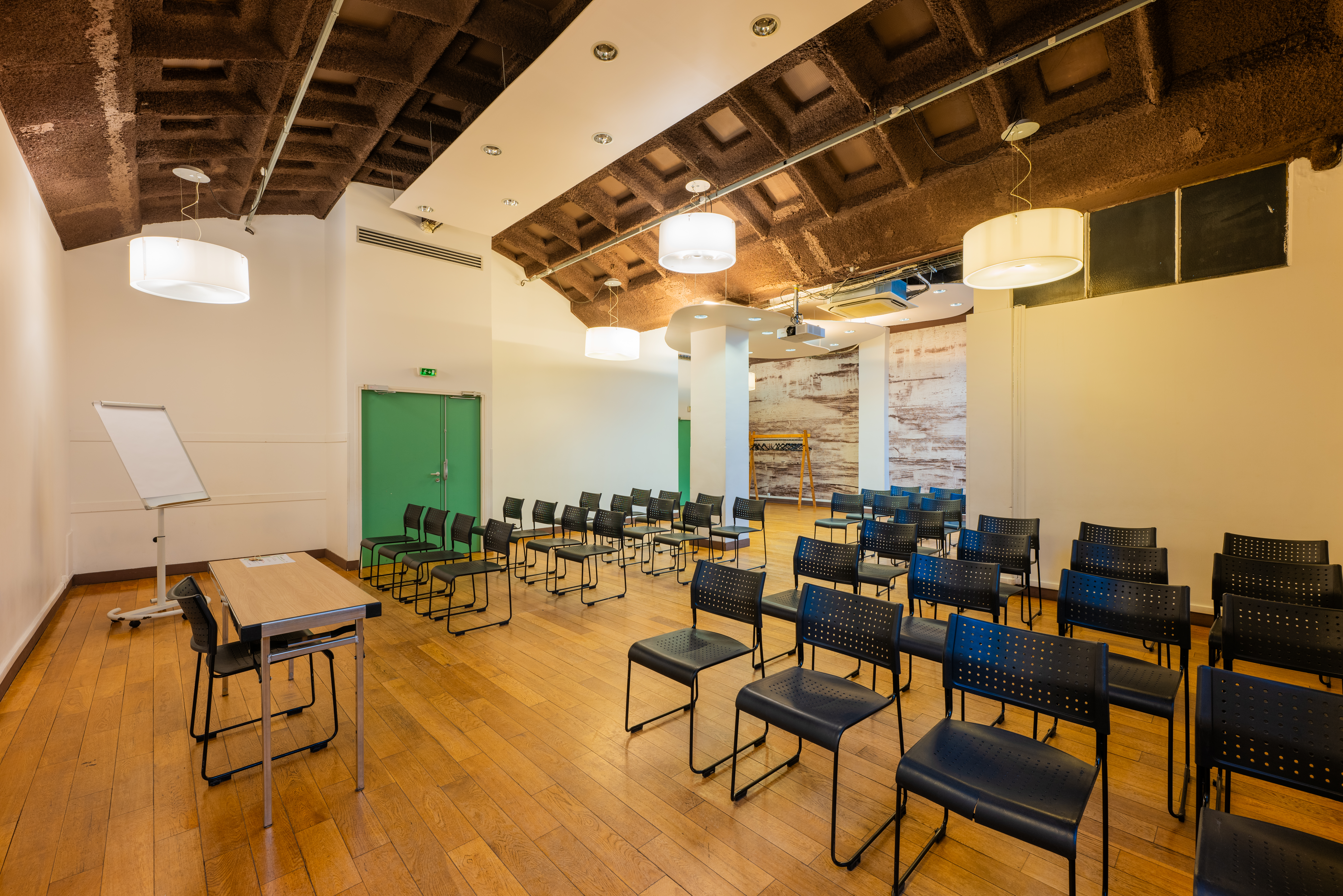 Equipée de tout le matériel nécessaire pour superviser au mieux vos événements,Idéal pour vos séminaires, congrès, assemblées générales et réunions, cet espace est en lumière du jour et est équipé de paperboard, fontaine à eau et portant pour vos vêtements.